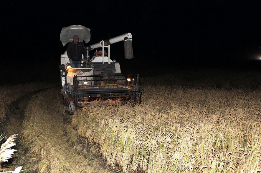 11月9日夜七時(shí)許,青口投資公司大新農(nóng)場,工會副主席王士超作為巡查組成員,正在組織二分場趙華勇條田水稻種植戶在搶收水稻。