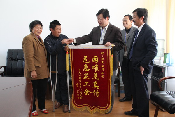 4月28日,巨龍農(nóng)貿(mào)市場特困職工劉元國拄著雙拐,在妻子陪伴下來公司送上錦旗,感謝干部職工的愛心捐助。去年初,下崗后在外謀生的劉元國因討要欠款發(fā)生車禍,腰部、腿部嚴(yán)重骨折,花費10萬余元,全家借錢度日。為讓劉家生活得到改善,春節(jié)前全公司發(fā)起獻愛心活動,共為劉元國募集錢款萬余元。(司宣)