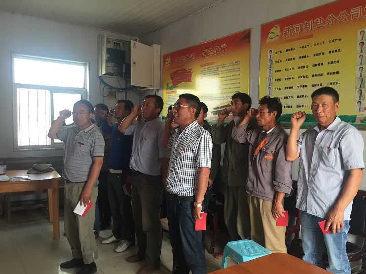 會議最后新河支部全體黨員重溫入黨誓詞。新河黨支部全體黨員起立。由支部書記李加新同志帶領(lǐng)大家宣讀誓詞。(新河支部程龍)