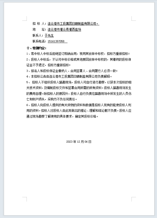 連云港市工投集團日曬制鹽有限公司機油等物資招標公告