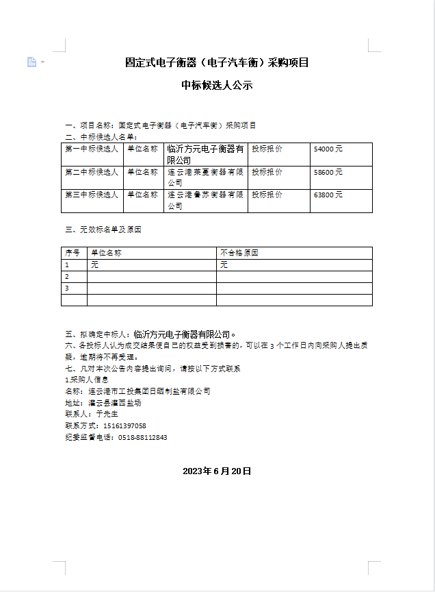 固定式電子衡器(電子汽車衡)采購(gòu)項(xiàng)目 中標(biāo)候選人公示