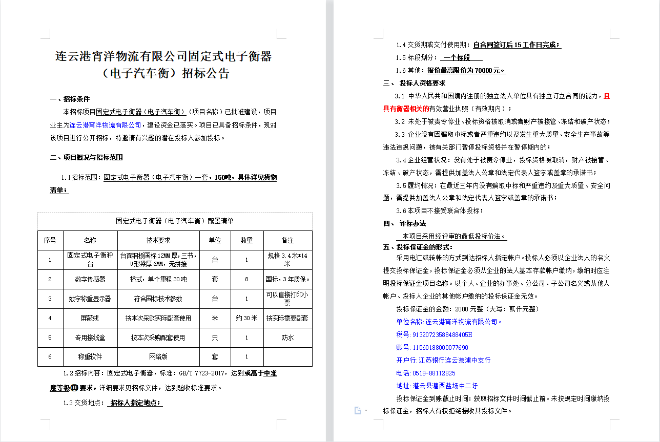 連云港宵洋物流有限公司固定式電子衡器(電子汽車衡)招標(biāo)公告
