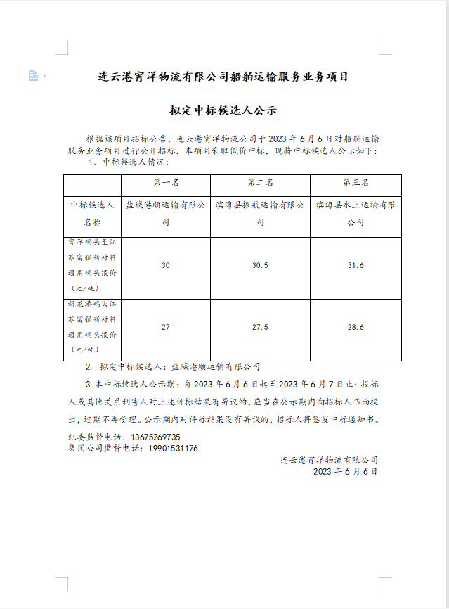 連云港宵洋物流有限公司船舶運輸服務(wù)業(yè)務(wù)項目擬定中標(biāo)候選人公示