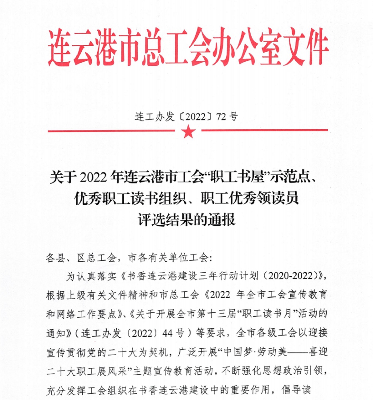 近日,工投金融板塊打造的“職工書屋”喜獲連云港市總工會(huì)授予“2022年連云港市工會(huì)職工書屋示范點(diǎn)”稱號(hào)。這是本年度全市45個(gè)示范點(diǎn)之一,也是金融板塊開展文化建設(shè)以來首次獲此殊榮。