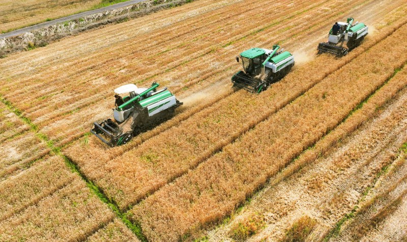 6月8日,在青口投資公司大新農(nóng)場(chǎng)鹽堿地種植區(qū),小麥一片金黃,麥穗顆粒飽滿,收割機(jī)在麥田里來回穿梭加緊搶收小麥。