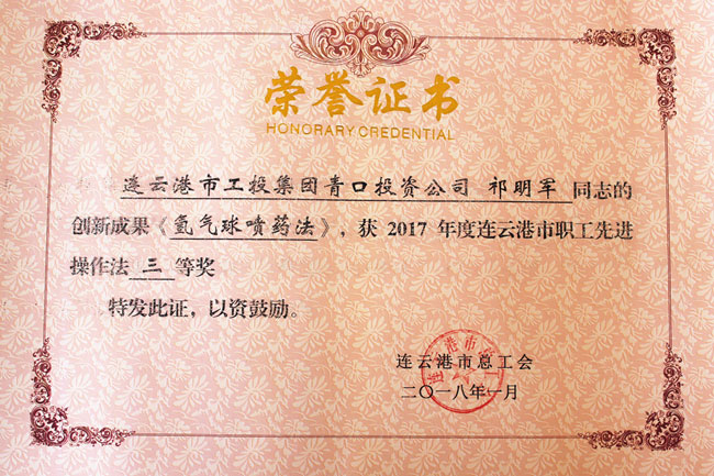 祁明軍的《氫氣球噴藥法》獲得2017年度連云港市職工先進(jìn)操作法三等獎(jiǎng)。由他發(fā)明的氫氣球噴藥法,噴藥機(jī)結(jié)構(gòu)簡(jiǎn)單,成本低廉,且可靈活調(diào)整,省工省時(shí),霧化效果好。目前該操作法已在青口公司全面推廣使用。?。ㄇ喙ぃ?/span>