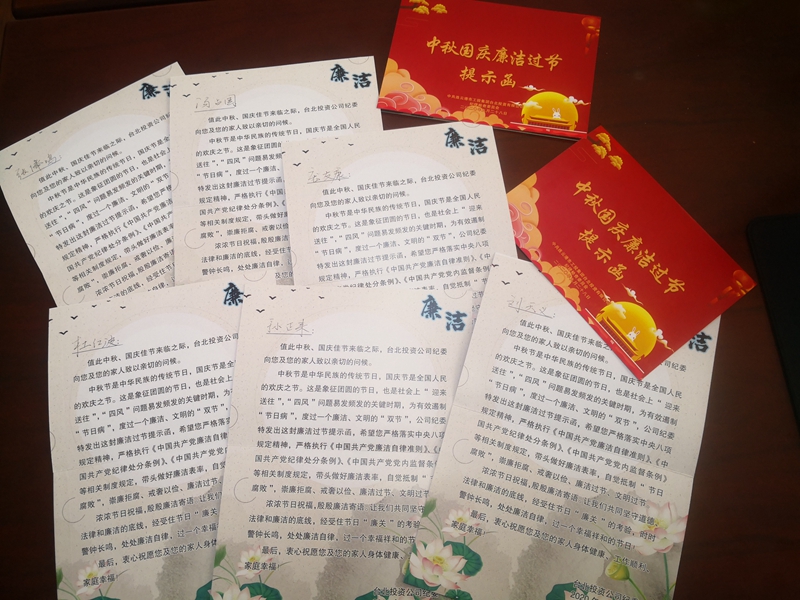 溫馨提示函早提醒。“值此中秋、國慶佳節(jié)來臨之際,臺(tái)北投資公司紀(jì)委向您和您的家人致以親切的問候……時(shí)時(shí)警鐘長(zhǎng)鳴,處處廉潔自律,過一個(gè)幸福祥和的節(jié)日!”節(jié)前,公司通過廉潔提示函向黨員領(lǐng)導(dǎo)干部贈(zèng)送節(jié)日廉潔提醒,將廉潔過節(jié)的紀(jì)律要求融入節(jié)日祝福。