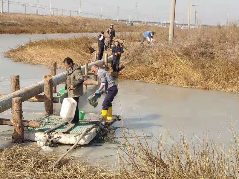 難!難!難!有困難才具有挑戰(zhàn),在“四拼”前一切困難皆為“紙老虎”,大家及時(shí)將壓力變?yōu)閯?dòng)力。確定方案后,立即分頭行動(dòng),一切工作按部就班,購買8米木樁,河岸邊專人指揮長臂挖掘機(jī)機(jī)械打樁,頭頂高壓線與通信線路相互交織,現(xiàn)場安全員全過程監(jiān)督指揮保障施工安全距離緊張施工,利用簡易泡沫筏人工敲開河面冰層,劃到河心鉆孔安裝木橫擔(dān),人工開挖河對岸管道,切割吊取管道,打磨涂覆,一切都在有條不紊的進(jìn)行中??紤]到玻璃鋼管道的易碎性,不敢使用挖掘機(jī)吊裝,只能全人工小心翼翼的一小段一小段的輕抬慢放,慢慢挪到門型橫擔(dān)上緩緩過河,捆綁固定,最后是對口纏裹涂覆回填竣工。