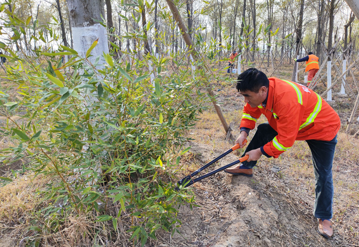 當(dāng)前,為扎實做好冬季樹木養(yǎng)護工作,提高樹木的過冬、抗病和抗蟲能力,李傳武帶領(lǐng)班組全員開展樹木涂白行動,悉心為樹木披上“防寒衣”。為達到同一標(biāo)準(zhǔn),他采用“立桿涂白法”,首先安排專人進行劃線,將行道樹涂白高度統(tǒng)一控制在1.2米,使區(qū)域內(nèi)涂白高度保持一致,確保樹木涂白效果與植物整體美觀,經(jīng)過10天的持續(xù)工作,完成10000余棵行道樹涂白工作(完成工作量約20%)。