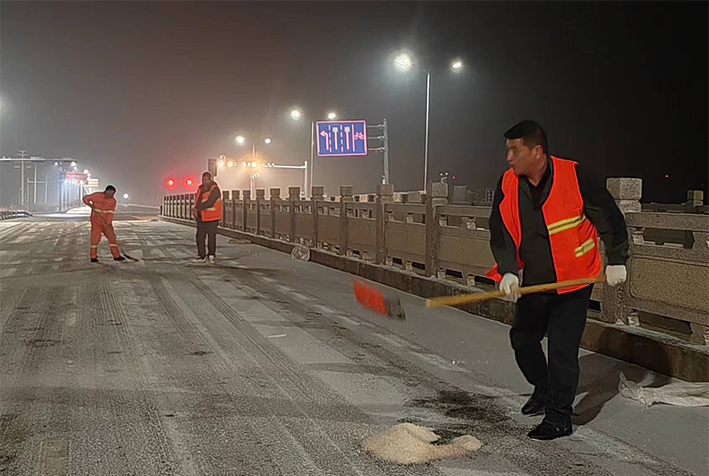 該公司除雪突擊隊由總經(jīng)理徐習(xí)華和副總王利分頭帶隊指揮,集結(jié)了安全部、管養(yǎng)部、綠化、保潔、市政、環(huán)衛(wèi)的突擊隊員80余名,出動5輛皮卡車、3輛皮卡、1臺裝載機(jī)和2輛巡查車,主要負(fù)責(zé)新區(qū)內(nèi)橋梁、連云開發(fā)區(qū)橋梁、徐新路、疏港大道、228省道等主要交通干道布撒融雪劑抗凍救災(zāi)工作。突擊隊員在進(jìn)行融雪劑撒布作業(yè)的同時,及時清理路面融化雪水,防止再次結(jié)冰,各除雪設(shè)備配合作業(yè),階梯式向前推進(jìn),提高除雪效率。(李敏 王宜全)