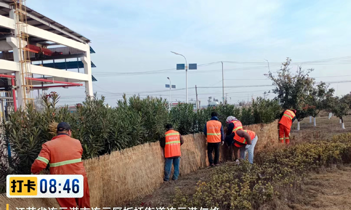 風(fēng)障防寒加速進(jìn)行。該分公司采購(gòu)草簾500余個(gè),對(duì)金港路、泰和路夾竹桃等不耐寒綠植精心呵護(hù)。確保低溫植株不被凍傷,不出現(xiàn)大面積凍害現(xiàn)象。目前已圍草簾300余個(gè)。